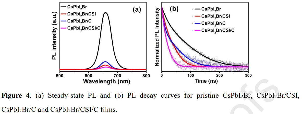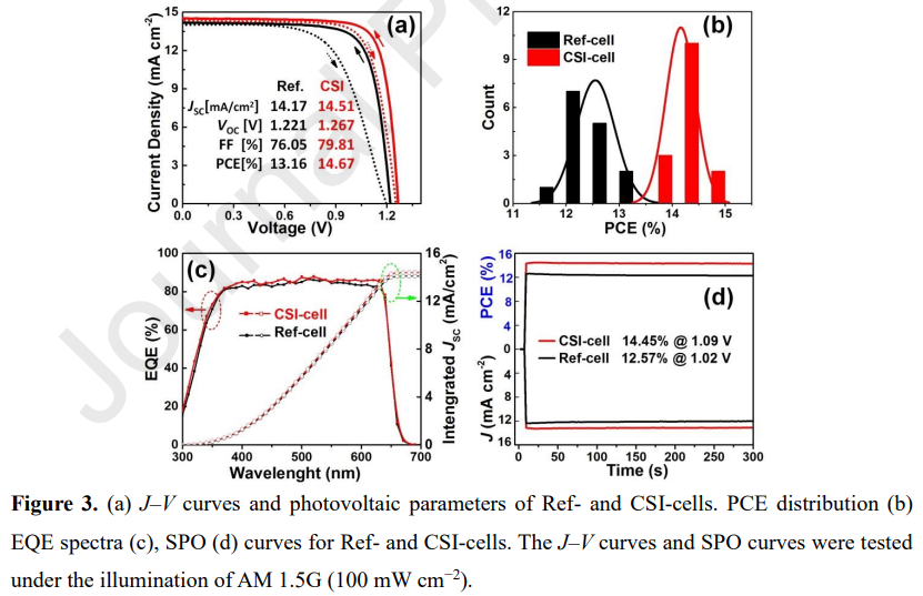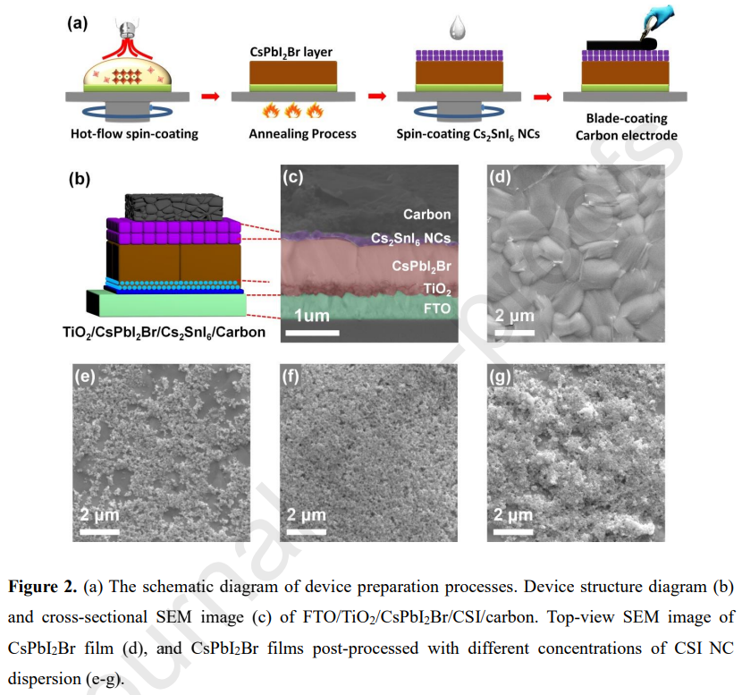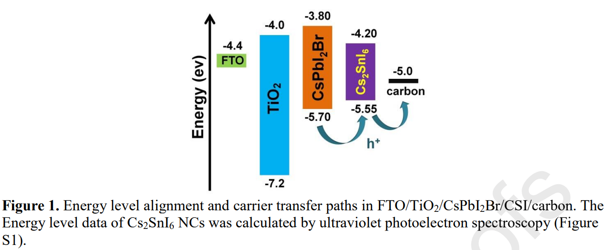 由于碳電極的化學(xué)惰性和耐濕性,基于碳電極的鈣鈦礦太陽能電池有望長期穩(wěn)定。然而,與傳統(tǒng)的金屬電極相比,碳基鈣鈦礦太陽能電池中鈣鈦礦和碳電極之間較大的能級失配導(dǎo)致空穴提取效率較低,光伏性能較差。鑒于此,2022年3月10日廣東省嶺南現(xiàn)代農(nóng)業(yè)實驗室&華南農(nóng)業(yè)大學(xué)饒華商團(tuán)隊于CEJ刊發(fā)Cs2SnI6納米晶體增強(qiáng)了高效碳基CsPbI2Br鈣鈦礦太陽能電池的空穴提取的研究成果。在這項工作中,合成了一種新型Cs2SnI6納米晶體 (CSI NCs) 的空穴傳輸材料 (HTM),并將其用于CsPbI2Br碳基鈣鈦礦太陽能電池。Cs2SnI6(-5.55 eV)合適的價帶最大位置構(gòu)成了CsPbI2Br/CSI/碳中的梯度能級排列,有效加速了空穴從鈣鈦礦到碳電極的提取,降低了界面處的非輻射復(fù)合損失。隨著在CsPbI2Br 鈣鈦礦薄膜和碳電極之間引入Cs2SnI6納米晶HTM,所得電池器件的功率轉(zhuǎn)換效率從13.16%提高(Jsc為14.17 mA cm-2,Voc為1.221 V,F(xiàn)F為76.05%)至14.67%(Jsc為14.51 mA cm-2,Voc為 1.267 V,F(xiàn)F為79.81%)。據(jù)我們所知,這是第一次將Cs2SnI6用作鈣鈦礦太陽能電池中的HTM,它在提高鈣鈦礦太陽能電池的空穴提取效率和光伏性能方面顯示出誘人的前景。