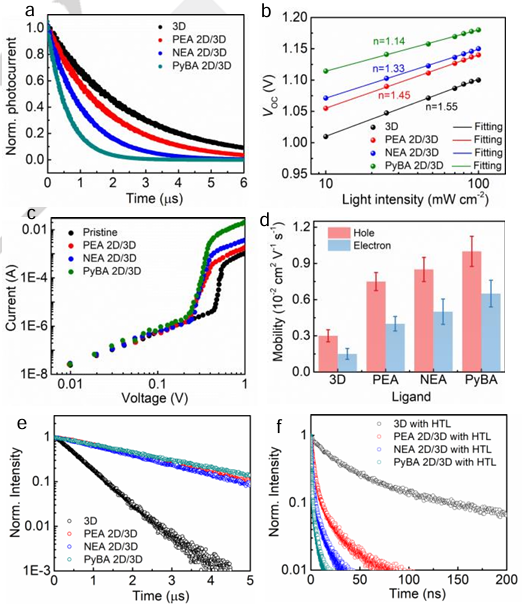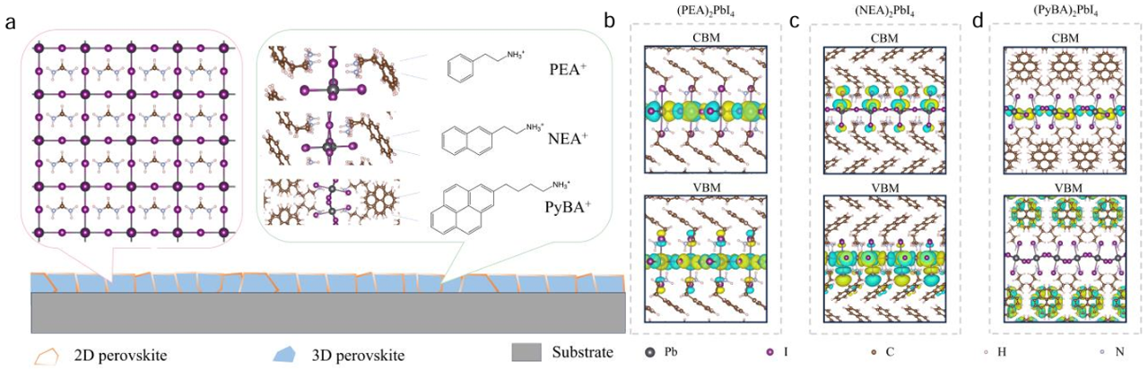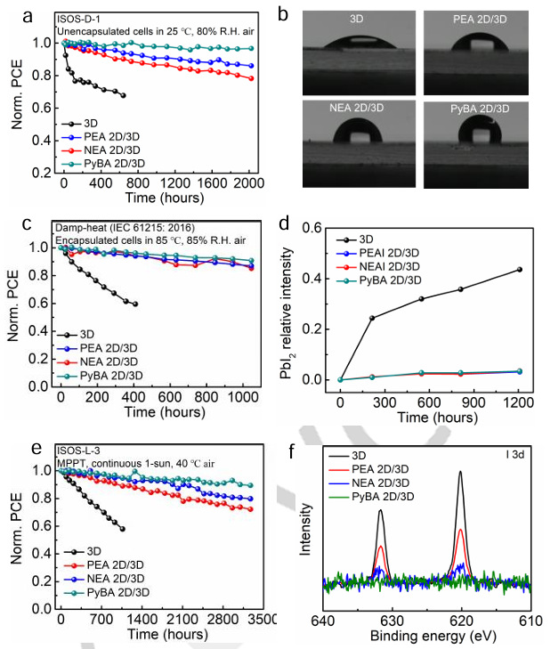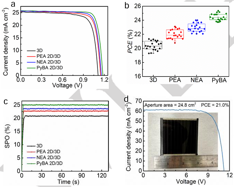 將2D鈣鈦礦納入3D鈣鈦礦吸收劑中,對(duì)于提高鈣鈦礦太陽(yáng)能電池的穩(wěn)定性和效率具有巨大潛力。然而,基于大體積陽(yáng)離子的2D結(jié)構(gòu)通常表現(xiàn)出較差的電荷傳輸,并且容易形成電荷提取屏障,從而阻礙器件的高效運(yùn)行。鑒于此,2024年10月6日南京航空航天大學(xué)趙曉明于Angew刊發(fā)間隔物共軛工程實(shí)現(xiàn)高效穩(wěn)定的2D/3D鈣鈦礦太陽(yáng)能電池和模組的研究成果,通過(guò)引入具有增強(qiáng)分子共軛性的芳香族間隔物來(lái)解決這些問(wèn)題。在測(cè)試的芳香族間隔物中,芘基丁胺(PyBA)間隔物由于共軛程度最高,因此在 2D/3D鈣鈦礦太陽(yáng)能電池中賦予2D鈣鈦礦出色的電荷傳輸特性和從體相鈣鈦礦中高效提取電荷。結(jié)果,在0.16 cm2單電池中實(shí)現(xiàn)了高達(dá)25.3%的功率轉(zhuǎn)換效率,在24.8 cm2模組中實(shí)現(xiàn)了21.0%的功率轉(zhuǎn)換效率。此外,加入的PyBA顯著提高了2D/3D鈣鈦礦太陽(yáng)能電池對(duì)濕氣和離子遷移的抵抗力,從而提高了環(huán)境、熱和運(yùn)行穩(wěn)定性。值得注意的是,基于PyBA的器件在25 ℃和80%相對(duì)濕度下運(yùn)行2000小時(shí)后,或在85 ℃和85%濕度下運(yùn)行 1000小時(shí)后,或在40 ℃下連續(xù)1個(gè)太陽(yáng)照射下運(yùn)行3000小時(shí)后,仍保持了其初始效率的90%以上,與之前報(bào)道的2D/3D鈣鈦礦太陽(yáng)能電池相比,其穩(wěn)定性得到了增強(qiáng)。