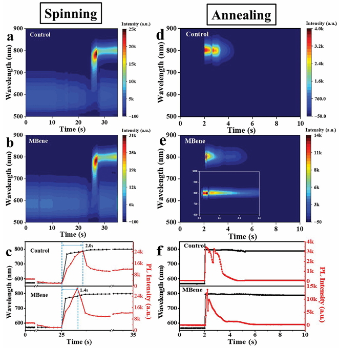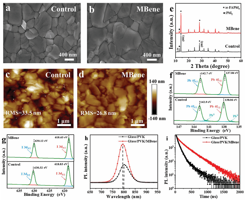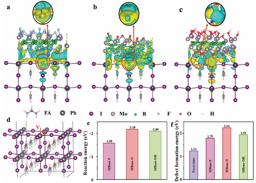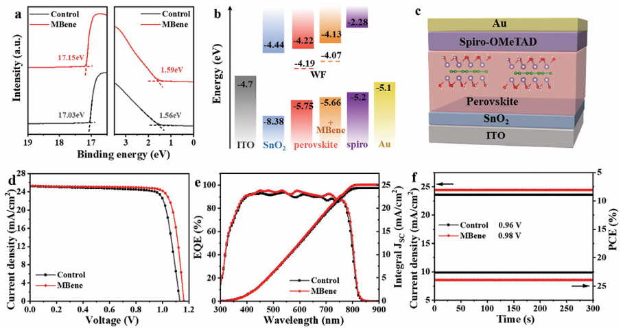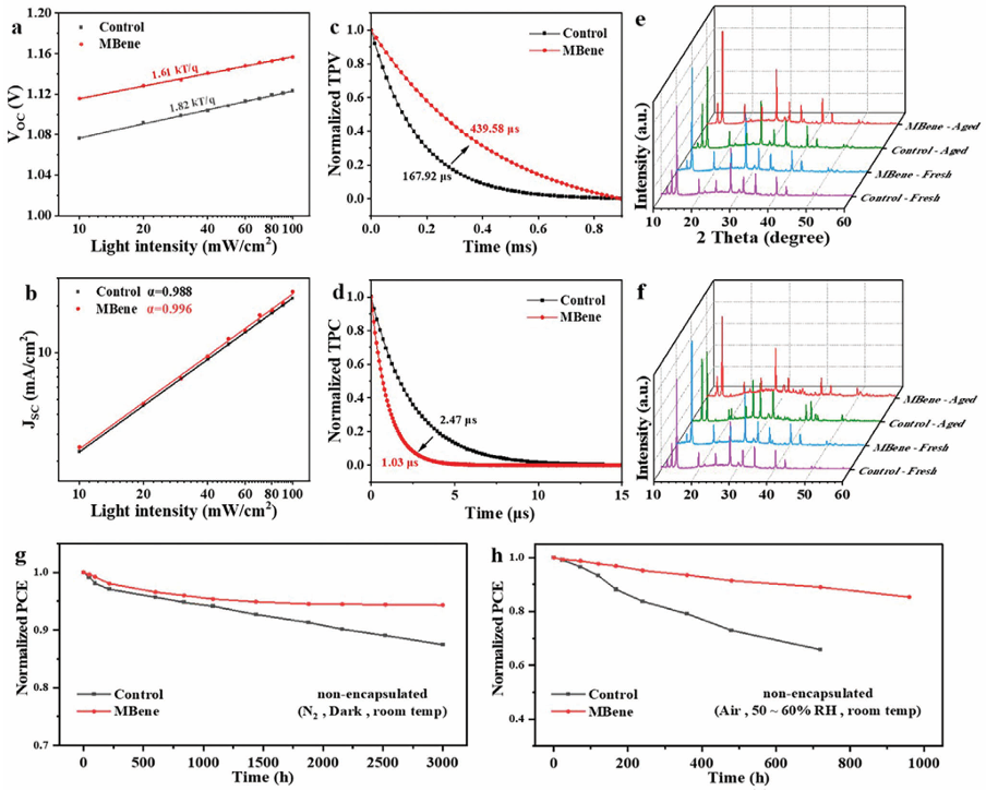 在環(huán)境空氣中制造的高性能鈣鈦礦太陽能電池被認(rèn)為是低成本商業(yè)制造的必然選擇。然而,鈍化鈣鈦礦薄膜缺陷和控制結(jié)晶過程對(duì)于實(shí)現(xiàn)鈣鈦礦太陽能電池的高性能至關(guān)重要。鑒于此,2024年10月6日華南理工大學(xué)於黃忠于AEM刊發(fā)使用后處理添加劑進(jìn)行晶體調(diào)制和界面鈍化,可以在空氣中制造高效穩(wěn)定的鈣鈦礦太陽能電池的研究成果,這項(xiàng)研究提出在綠色反溶劑中使用新型二維材料MBene來同時(shí)調(diào)節(jié)鈣鈦礦的結(jié)晶和鈍化缺陷。MBene促進(jìn)未配位 Pb2+離子的鈍化,從而提高鈣鈦礦薄膜內(nèi)空位的形成能并調(diào)整能級(jí)結(jié)構(gòu)。此外,MBene增加了鈣鈦礦的成核位點(diǎn),顯著延長了晶體生長并提高了薄膜結(jié)晶度,從而減少了非輻射復(fù)合。因此,用MBene處理的冠軍器件在空氣中制造時(shí)實(shí)現(xiàn)了24.22%的功率轉(zhuǎn)換效率,并表現(xiàn)出優(yōu)異的濕度和長期穩(wěn)定性。此外,添加MBene的鈣鈦礦太陽能電池在包括濕度和熱量在內(nèi)的各種環(huán)境條件下表現(xiàn)出顯著的長期穩(wěn)定性。研究成果為MBene材料在光伏領(lǐng)域的發(fā)展奠定了基礎(chǔ),揭示了其作為鈣鈦礦中一種新型二維材料的作用機(jī)理,為工業(yè)化生產(chǎn)高效穩(wěn)定的太陽能電池提供了新的思路。