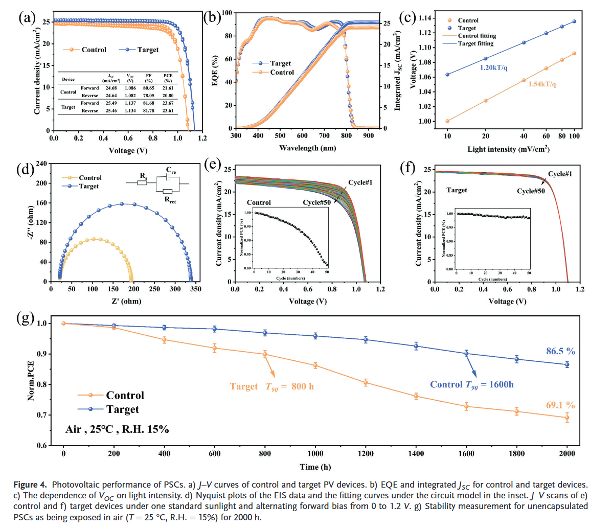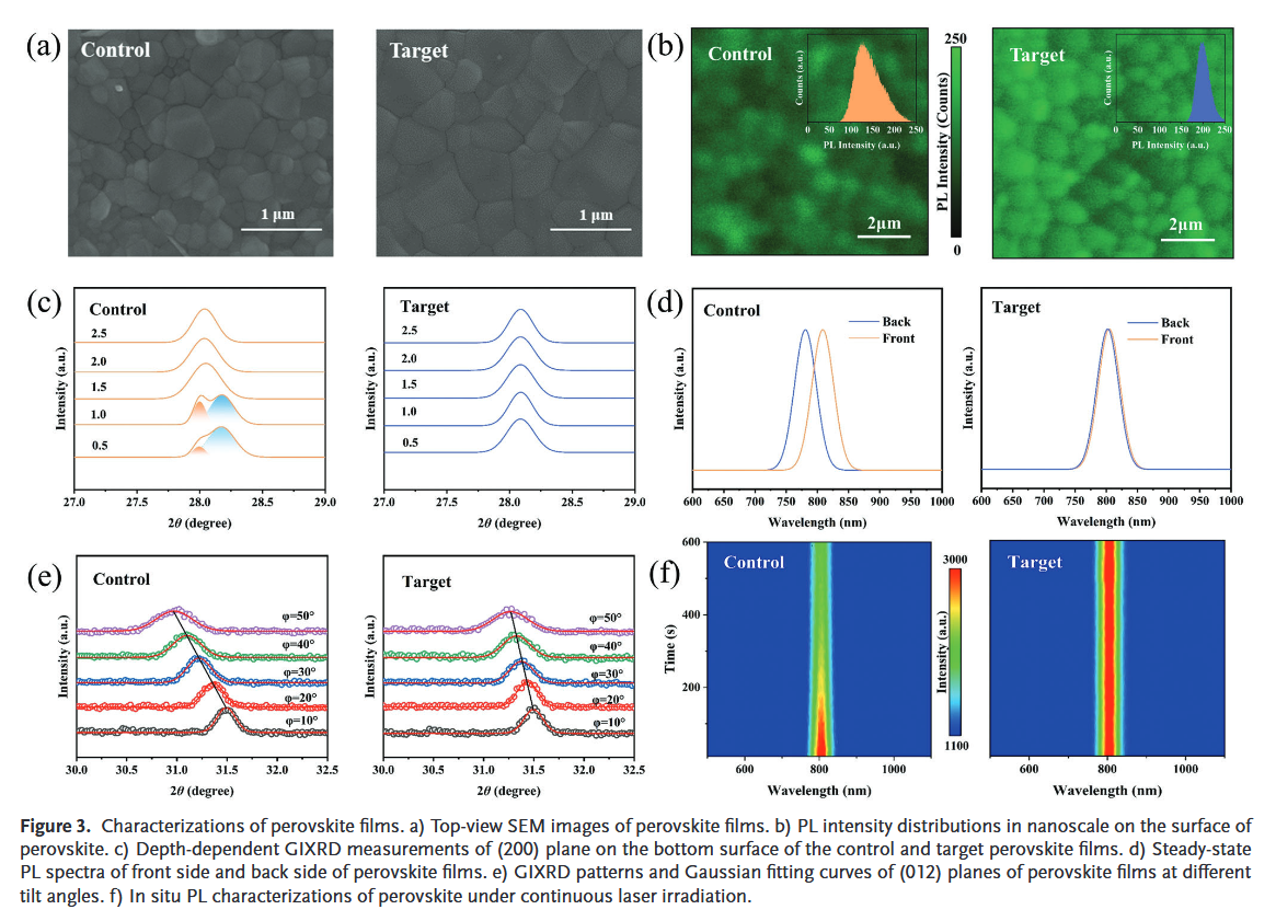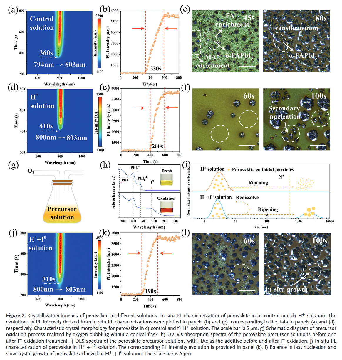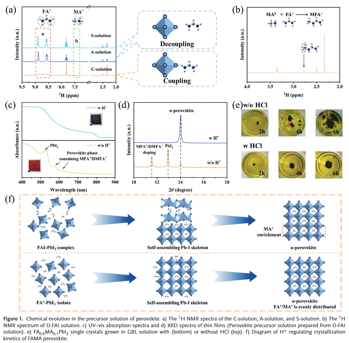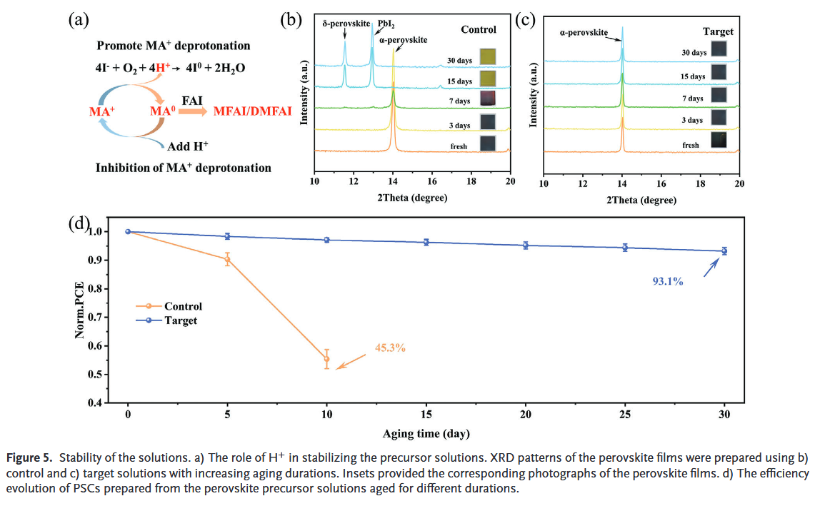 由于前驅(qū)體溶液中復(fù)雜的化學(xué)演化,MA在 FAMA 混合鈣鈦礦中的作用還遠(yuǎn)未被完全了解。任意調(diào)整FAMA混合鈣鈦礦中MA的含量仍然是一個巨大的挑戰(zhàn)。這項研究闡明了H+和 I? 氧化之間的協(xié)同效應(yīng),它有助于降低以 FA 為主的鈣鈦礦中 MA 的含量。簡而言之,過量的H+促進了以FA為主的鈣鈦礦中MA和FA組分的平衡和快速組裝,并阻礙了前驅(qū)體溶液中MA和FA之間的親核反應(yīng)引起的不利化學(xué)演化,而I?氧化加速了鈣鈦礦的原位結(jié)晶。利用這種協(xié)同效應(yīng),成功制造了具有任意可調(diào)x值的厘米級 FAxMA(1-x)PbI3單晶。此外,引入過氧乙酸作為添加劑,使用刮刀涂布工藝的FA0.9MA0.1PbI3鈣鈦礦太陽能電池(PSC)達到令人印象深刻的23.7%的效率。這里實現(xiàn)的效率是迄今為止FA含量超過 90% 的刮刀涂布PSC 的最高值之一。本研究中開發(fā)的優(yōu)化解決方案實現(xiàn)了卓越的穩(wěn)定性,使其可以在空氣條件下儲存超過2個月,而電池效率不會明顯下降。該結(jié)果滿足商業(yè)化的要求。
