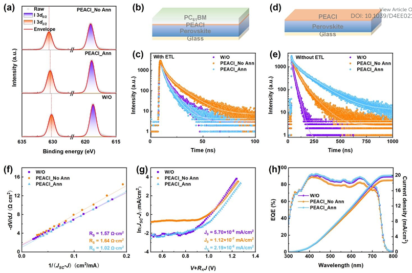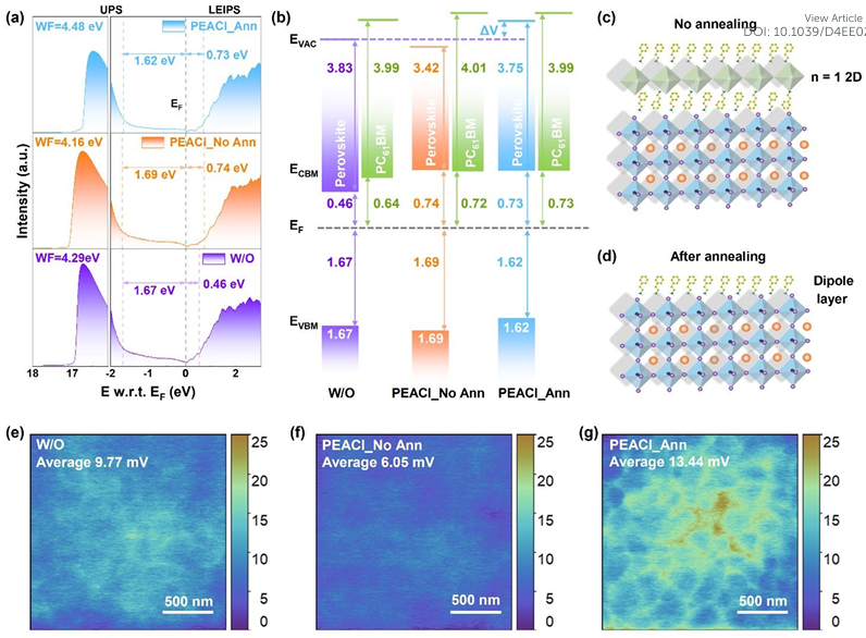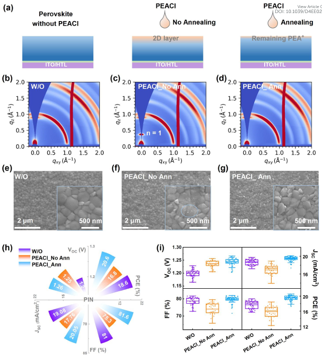 二維和三維(2D/3D)異質(zhì)結(jié)已廣泛用于改善正式鈣鈦礦太陽能電池的性能。然而,鈣鈦礦表面的2D配體(如苯乙銨(PEA+))的電子阻擋性質(zhì)不利于反式鈣鈦礦太陽能電池。鑒于此,2024年10月1日沖繩科學技術(shù)大學Luis K. Ono&北京交通大學徐征&上海交通大學戚亞冰于EES刊發(fā)揭示苯乙銨誘導的鈣鈦礦表面二維相與反式寬帶隙鈣鈦礦太陽能電池性能之間的關(guān)系的研究成果,通過隨后的退火工藝消除鈣鈦礦表面的2D相來提高器件性能。消除2D相后,剩余的PEA+形成偶極層,導致鈣鈦礦和電子傳輸層之間具有出色的能級對齊。結(jié)果表明,1.67 eV 寬帶隙三陽離子反式鈣鈦礦太陽能電池光電轉(zhuǎn)換效率提高至20.61%,短路電流密度達到20.05 mA/cm2,填充因子達到81.57%,開路電壓由1.20 V 提高到1.26 V,開路電壓損失為410 mV,是寬帶隙反式鈣鈦礦太陽能電池中最低的開壓損失之一。