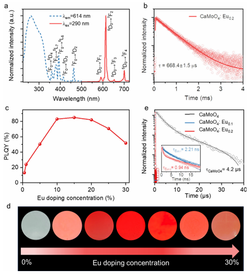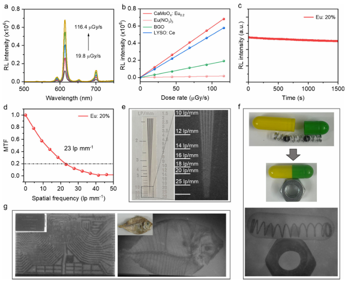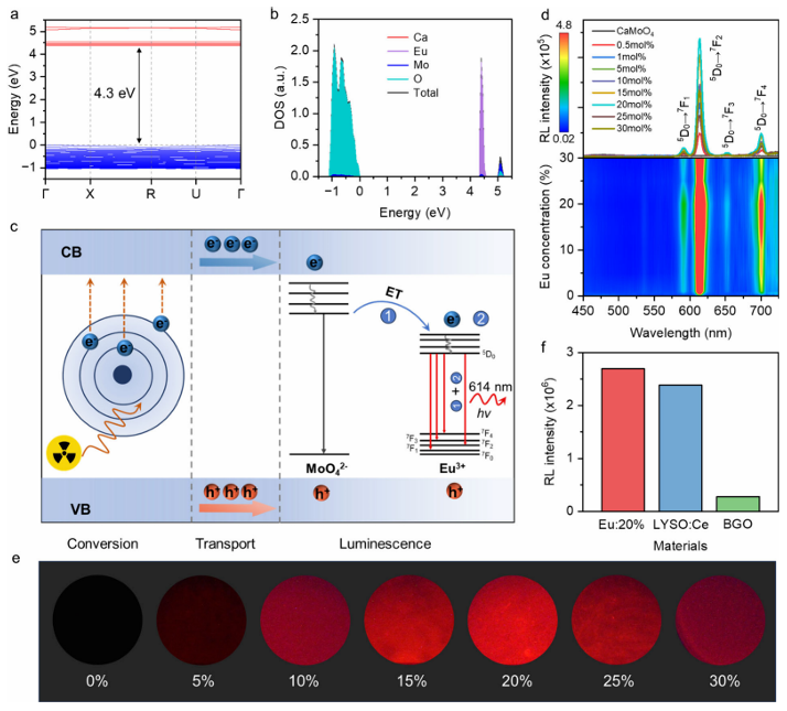 能量供體的超強(qiáng)天線效應(yīng)有效提高了光收集系統(tǒng)反應(yīng)中心的性能。鑒于此,2024年9月29日阿卜杜拉國(guó)王科技大學(xué)Omar F. Mohammed&Osman M. Bakr&浙江工業(yè)大學(xué)朱藝涵于AEL刊發(fā)鑭系金屬摻雜的光收集量子點(diǎn),用于卓越的X射線成像閃爍體的研究成果,成功利用了這種特殊能力來(lái)開(kāi)發(fā)高性能的X射線成像閃爍體屏幕。具有原子級(jí)分辨率的電子顯微鏡成像和理論計(jì)算表明,在鑭系離子摻雜的CaMoO4(Ln3+–CaMoO4,Ln = Eu或Tb)量子點(diǎn)(QD)中,Ln3+均勻分布在整個(gè)CaMoO4晶格中。Ln3+和CaMoO4 QD之間的協(xié)同作用放大了X射線光子吸收能力,并實(shí)現(xiàn)了從CaMoO4 QD天線到Ln3+發(fā)射中心的有效能量傳輸,從而顯著提高了QD屏幕的X射線靈敏度和成像分辨率。例如,CaMoO4:(Eu3+)0.20 QD 屏幕表現(xiàn)出令人印象深刻的X射線成像分辨率,超過(guò)23 lp/mm,優(yōu)于大多數(shù)公認(rèn)的有機(jī)和傳統(tǒng)無(wú)機(jī)閃爍體。這些發(fā)現(xiàn)可以將摻雜QD定位為有前途的X射線成像閃爍體,并可能應(yīng)用于醫(yī)學(xué)放射學(xué)和安全檢查。