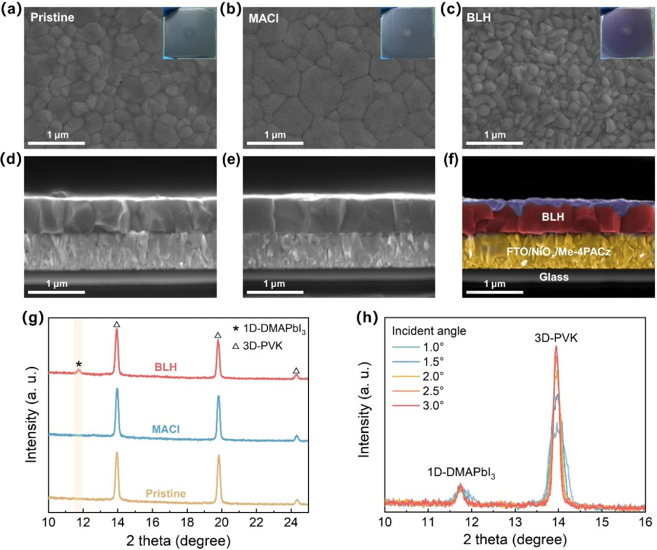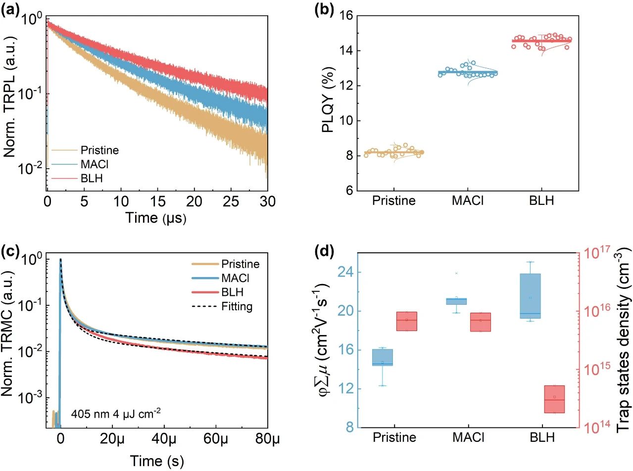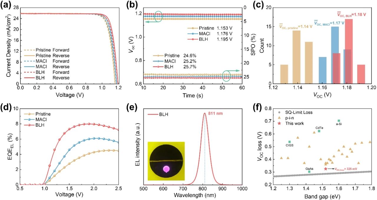 鈣鈦礦太陽(yáng)能電池的效率與SQ理論極限仍存在較大的差距,主要由于鈣鈦礦上表面高缺陷態(tài)密度造成的開壓損耗所致。鑒于此,2024年10月3日武漢大學(xué)王植平于AM刊發(fā)了一種巧妙的表面“溶解-再結(jié)晶”策略,并構(gòu)建出獨(dú)特的雙層異質(zhì)結(jié)(BLH)。這種BLH結(jié)構(gòu)可將鈣鈦礦/C60界面處缺陷態(tài)密度降低至前所未有的水平。與傳統(tǒng)2D異質(zhì)結(jié)膜厚(5-20 nm)不同,BLH結(jié)構(gòu)的膜厚可達(dá)50-70 nm且不影響載流子的層間傳輸。更重要地是,在1.52 eV帶隙的BLH結(jié)構(gòu)器件中,Voc損失降低至325 mV,達(dá)到了SQ理論極限的97%以上,足以媲美GaAs太陽(yáng)能電池。相應(yīng)器件的光電轉(zhuǎn)化效率也突破至26.1%(認(rèn)證效率25.72%)。該項(xiàng)研究對(duì)于鈣鈦礦光伏領(lǐng)域發(fā)展具有極其重要的意義,攻克了長(zhǎng)期以來(lái)限制鈣鈦礦太陽(yáng)能電池高效率的瓶頸。