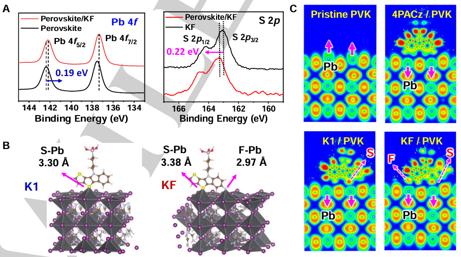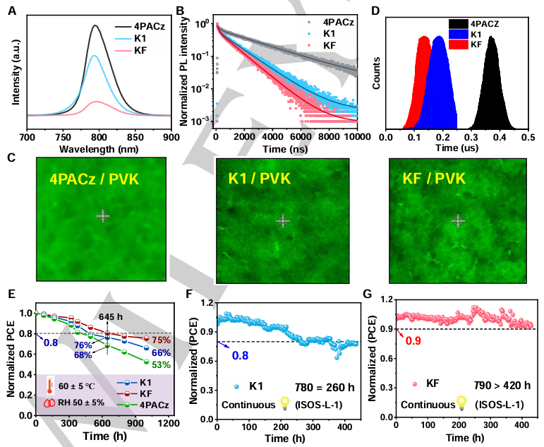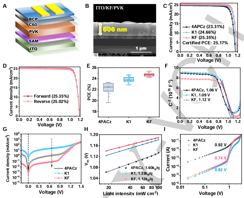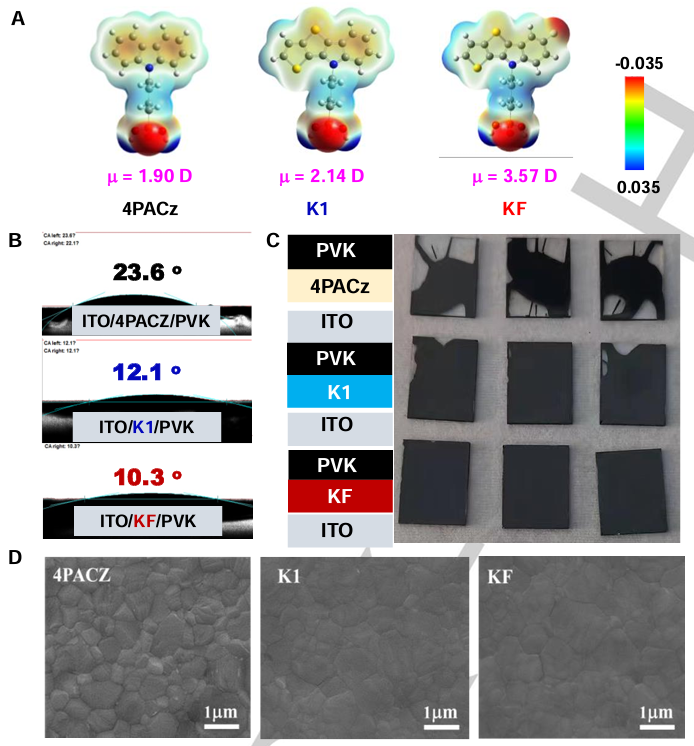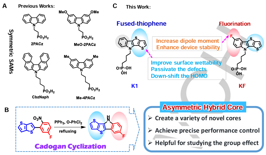 咔唑基自組裝分子(SAM)因其獨(dú)特的分子性質(zhì)而被廣泛應(yīng)用于反式鈣鈦礦太陽(yáng)能電池。然而,咔唑基SAM的對(duì)稱結(jié)構(gòu)使其性能難以精細(xì)調(diào)控,阻礙了反式鈣鈦礦太陽(yáng)能電池效率和穩(wěn)定性的進(jìn)一步提高。鑒于此,2024年10月5日天津理工大學(xué)宗雪平&梁茂于Angew刊發(fā)通過(guò)混合策略對(duì)咔唑基自組裝單層進(jìn)行不對(duì)稱改性以用于反式鈣鈦礦太陽(yáng)能電池的研究成果,這項(xiàng)工作表明,通過(guò)構(gòu)建不對(duì)稱咔唑核心,可以有效調(diào)控SAM分子的關(guān)鍵性質(zhì)。已證實(shí)該不對(duì)稱核心的雜化噻吩并[2,3-b]噻吩單元決定了SAM的能級(jí)、表面潤(rùn)濕性和缺陷鈍化能力,而核心的取代基對(duì)分子偶極矩和器件穩(wěn)定性有更大的影響。噻吩并[2,3-b]噻吩和氟的協(xié)同作用使KF衍生的反式鈣鈦礦太陽(yáng)能電池表現(xiàn)出25.17%的認(rèn)證能量轉(zhuǎn)換效率和優(yōu)異的運(yùn)行穩(wěn)定性。這種混合設(shè)計(jì)概念為反式鈣鈦礦太陽(yáng)能電池中SAM的進(jìn)一步結(jié)構(gòu)修改提供了一種有前景的方法。