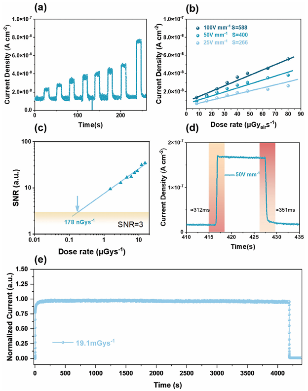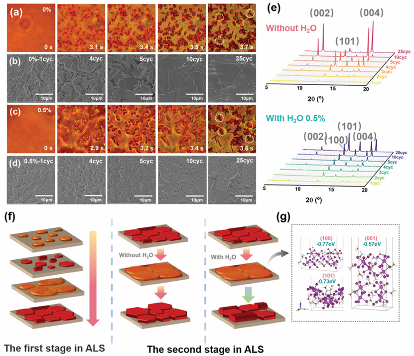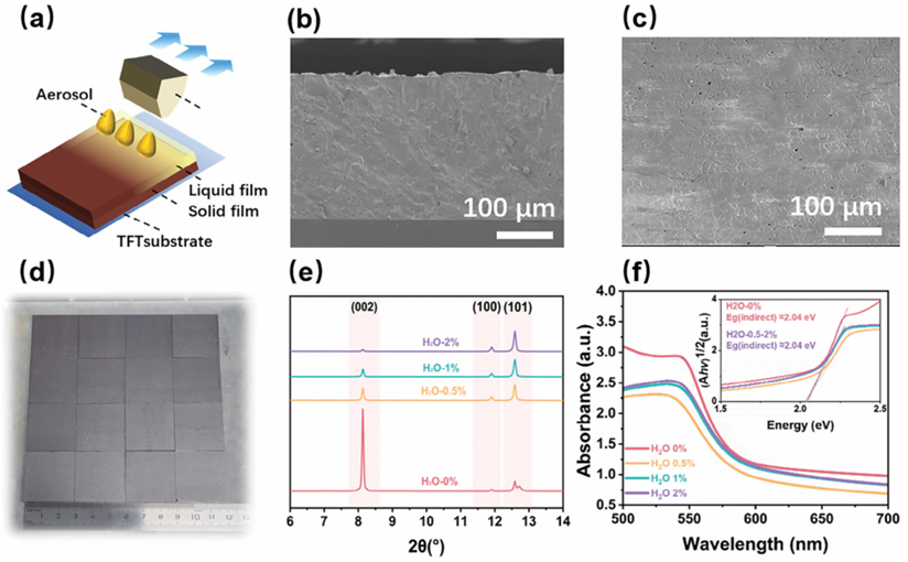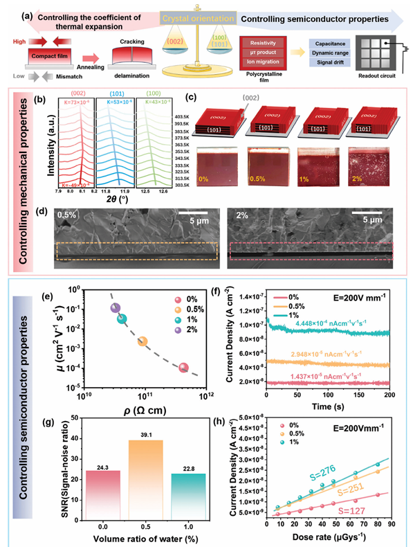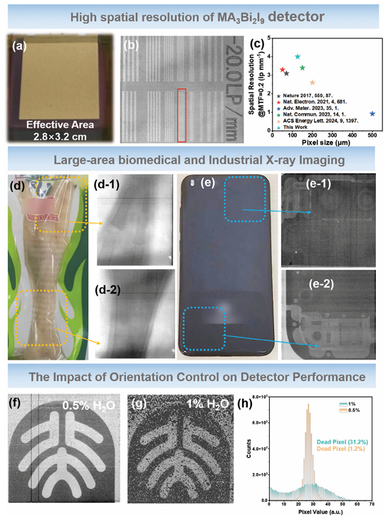 鹵化物鈣鈦礦被認(rèn)為是用于直接X(jué)射線探測(cè)器的極具前景的光電子材料,但要實(shí)現(xiàn)大面積平板成像,需要解決鈣鈦礦和讀出電路板之間的電子、表面和機(jī)械性能的兼容性問(wèn)題。鑒于此,2024年9月30日北京大學(xué)深圳研究生院王新煒&楊世和于AFM刊發(fā)晶體取向控制增強(qiáng)鈣鈦礦與大面積讀出板的附著力,實(shí)現(xiàn)高性能X射線成像的研究成果,選擇低維MA3Bi2I9鈣鈦礦,通過(guò)利用鈣鈦礦薄膜生長(zhǎng)的取向控制策略,在兩者之間實(shí)現(xiàn)良好的平衡。取向控制生長(zhǎng)最顯著的結(jié)果是厚鈣鈦礦薄膜在大面積電子板上具有出色的附著力,并有效解決了電荷共享效應(yīng),而這一直很難實(shí)現(xiàn)。最終的探測(cè)器的X射線成像面積為2.8×3.2 cm2,空間分辨率為4.0 lp mm?1,這是基于TFT背板的多晶鈣鈦礦探測(cè)器迄今為止達(dá)到的最高分辨率,靈敏度為588 μC Gyair?1cm?2,同時(shí)保持暗電流低于10 nA cm-2,這也是迄今為止多晶零維鈣鈦礦探測(cè)器的最高值。該裝置清晰地揭示了生物標(biāo)本和工業(yè)產(chǎn)品復(fù)雜的內(nèi)部結(jié)構(gòu)。這一結(jié)果展示了零維鈣鈦礦在X射線平面成像中的潛力,并強(qiáng)調(diào)了取向控制策略的關(guān)鍵作用。