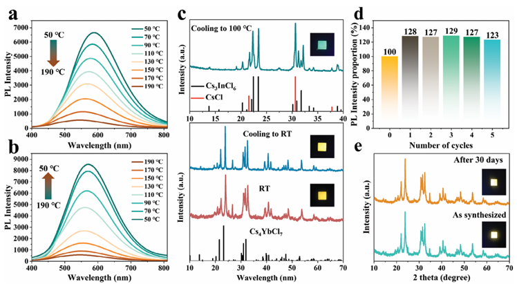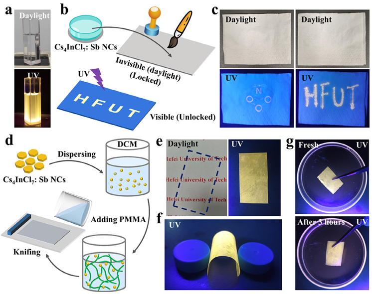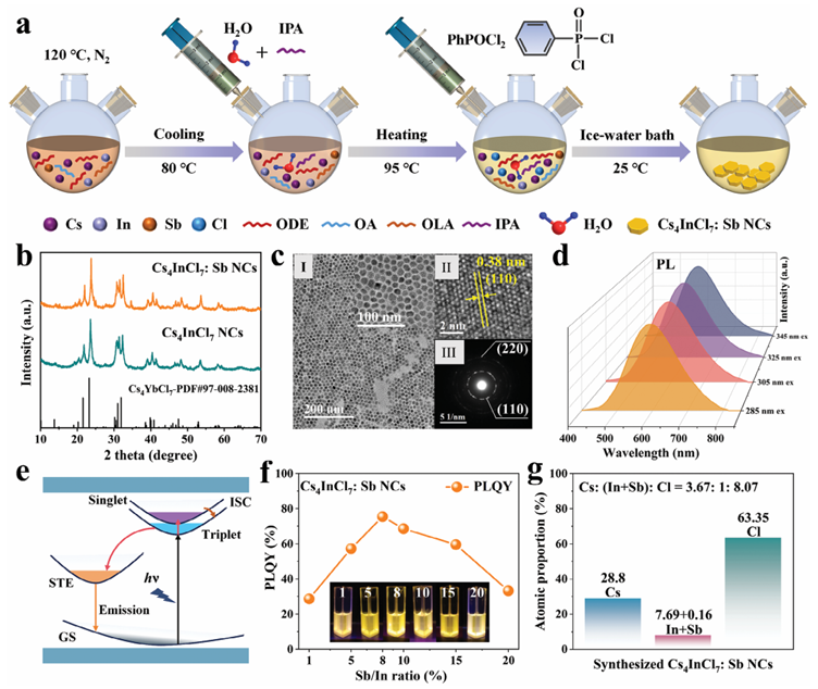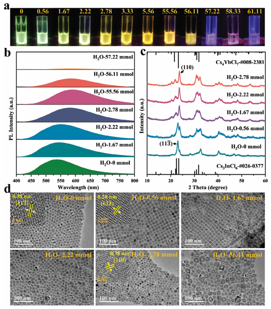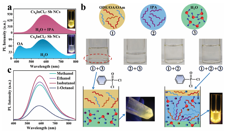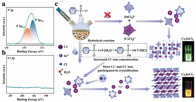 全無機鈣鈦礦納米晶體的相控合成已引起光電應(yīng)用的廣泛關(guān)注。然而,通常被認(rèn)為是不利因素的H2O并未被發(fā)現(xiàn)會影響所得的相組成。鑒于此,2024年12月30日合肥工業(yè)大學(xué)童國慶&蔣陽于AFM刊發(fā)水解反應(yīng)誘導(dǎo)的Sb摻雜零維鈣鈦礦Cs-In-Cl納米晶體的相調(diào)控及其在光電和信息加密中的應(yīng)用的研究成果,本文報道了通過操縱H2O添加來水解反應(yīng)誘導(dǎo)的0D鈣鈦礦Cs–In–Cl: Sb納米晶體相調(diào)節(jié)。具體而言,在沒有添加H2O的情況下,Cs–In–Cl: Sb結(jié)晶為 Cs3InCl6: Sb。相反,添加H2O會觸發(fā)注入的氯源(苯基膦二氯化物,PhPOCl2)的水解,導(dǎo)致Cl?離子濃度增加,隨后促進Cs4InCl7: Sb納米晶的形成。此外,異丙醇(IPA)與H2O/油酸(OA)/油胺(OAm)之間形成的氫鍵減輕了1-十八烯(ODE)/OA/OAm混合物與H2O之間的不混溶性,從而促進了Cs4InCl7: Sb納米晶上OA/OAm的鈍化。此外,還證明了Cs4InCl7: Sb 和Cs3InCl6: Sb之間的可逆相變可以通過加熱-冷卻循環(huán)實現(xiàn)。此外,還展示了基于Cs4InCl7: Sb納米晶的白光發(fā)光二極管、信息加密和熒光復(fù)合膜的應(yīng)用。這項工作不僅為調(diào)節(jié)鈣鈦礦的相組成開辟了新策略,而且還為多功能應(yīng)用引入了一種新型熒光材料Cs4InCl7: Sb。